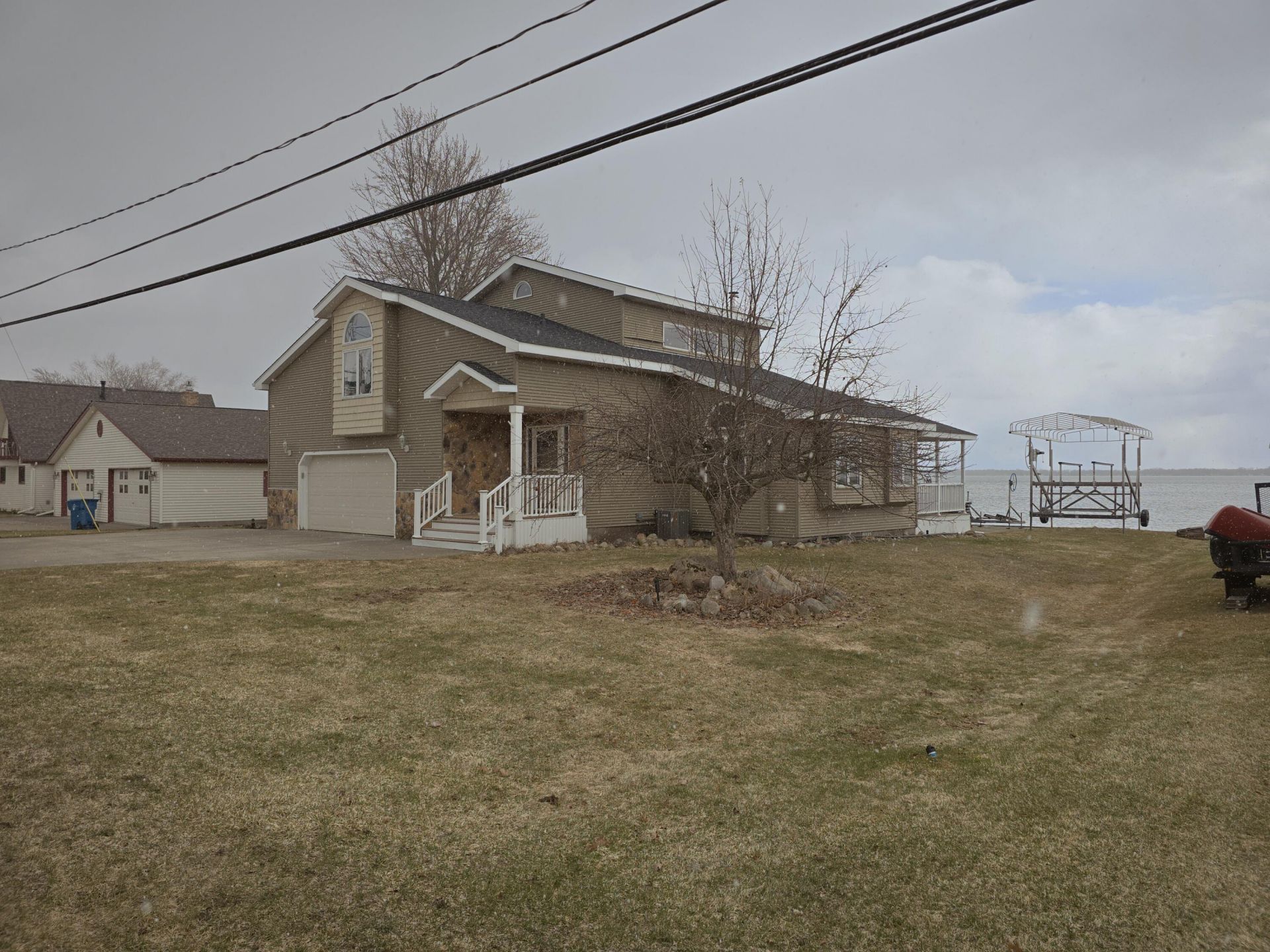 Lakefront with Spectacular sunset & sunrise Views! 5 bedrooms 3 full baths with 95 feet of Houghton Lakefront. Metal seawall, Covered back deck overlooking lush green landscaped yard and concrete slab with built in fire pit. Forced Air Natural Gas Heat, Central AC , Lake views from almost every room Stone faces wood burning fireplace, quartz countertops Tile and hardwood flooring, Vaulted ceilings custom lighting attached finished & heated 2.5 garage