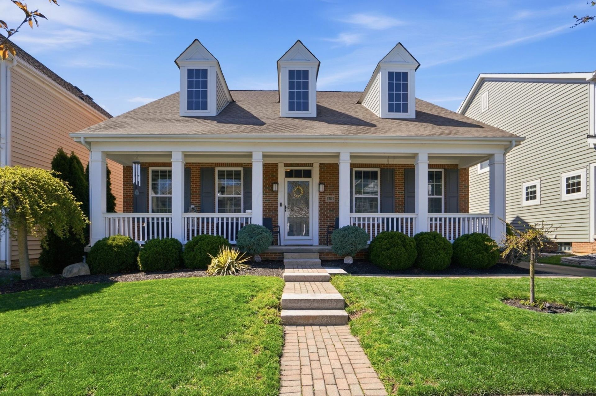 Welcome to this charming Cape Cod in Westerville Schools, offering timeless curb appeal and modern comfort throughout. With brick on three sides, a full front porch, and a back-load garage, this home blends classic style with thoughtful design.Step inside to a bright, open layout anchored by a huge chef's kitchen--complete with granite countertops, wall oven, gas cooktop, and an expansive island that flows seamlessly into the great room. It's the perfect setup for cooking, gathering, and entertaining.The first-floor primary suite provides true convenience, featuring an attached full bathroom with a soaking tub, separate shower, and a walk-in closet.Upstairs, you'll find a spacious bonus room, a cozy loft, and two additional bedrooms, giving everyone room to spread out.The full basement offers even more potential with poured walls and a rough-in for a full bathroom, making future finishing easy.Outside, enjoy a covered patio overlooking the fenced yard, ideal for relaxing, grilling, or letting pets play freely.With its thoughtful layout, premium kitchen, first-floor primary suite, and flexible second-floor spaces, this home delivers comfort, character, and room to grow--all in the highly desirable Westerville School District.
