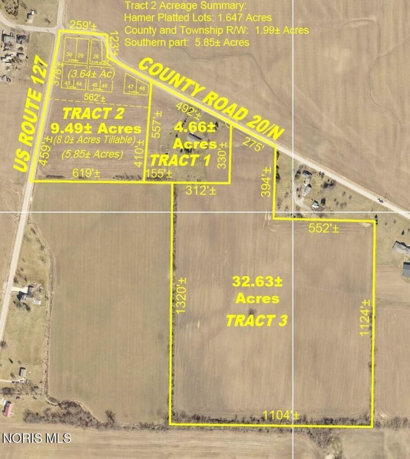 Tract 2 of 3: 7.5+/- acres. Predominant soil types are Blount loam (Blo2A1, Blo2B1) and Haskins loam (HnA). Great farming opportunity, exceptional building site or add to the homesite for more space to expand. The North end of this tract was previously subdivided for potential building lots resulting in rights-of-way being owned by the township. Buyer would be responsible to contact the township to inquire about the ability to vacate existing rights-of-way. There is potential to add an additional 1.99± acres to the total tract if the new owner pursues the vacate process. Selling at public auction Thursday, May 7 @ 6 pm. Auction held offsite at the Kissell Building, 509 N. Main St., West Unity, OH. Multi-par auction, purchase individually or in combination with other tract(s). Sold as is. 5% non-refundable down payment due at end of auction, balance at closing on or before 30 days. OPEN HOUSE: April 23, 5-6 pm or by appointment.