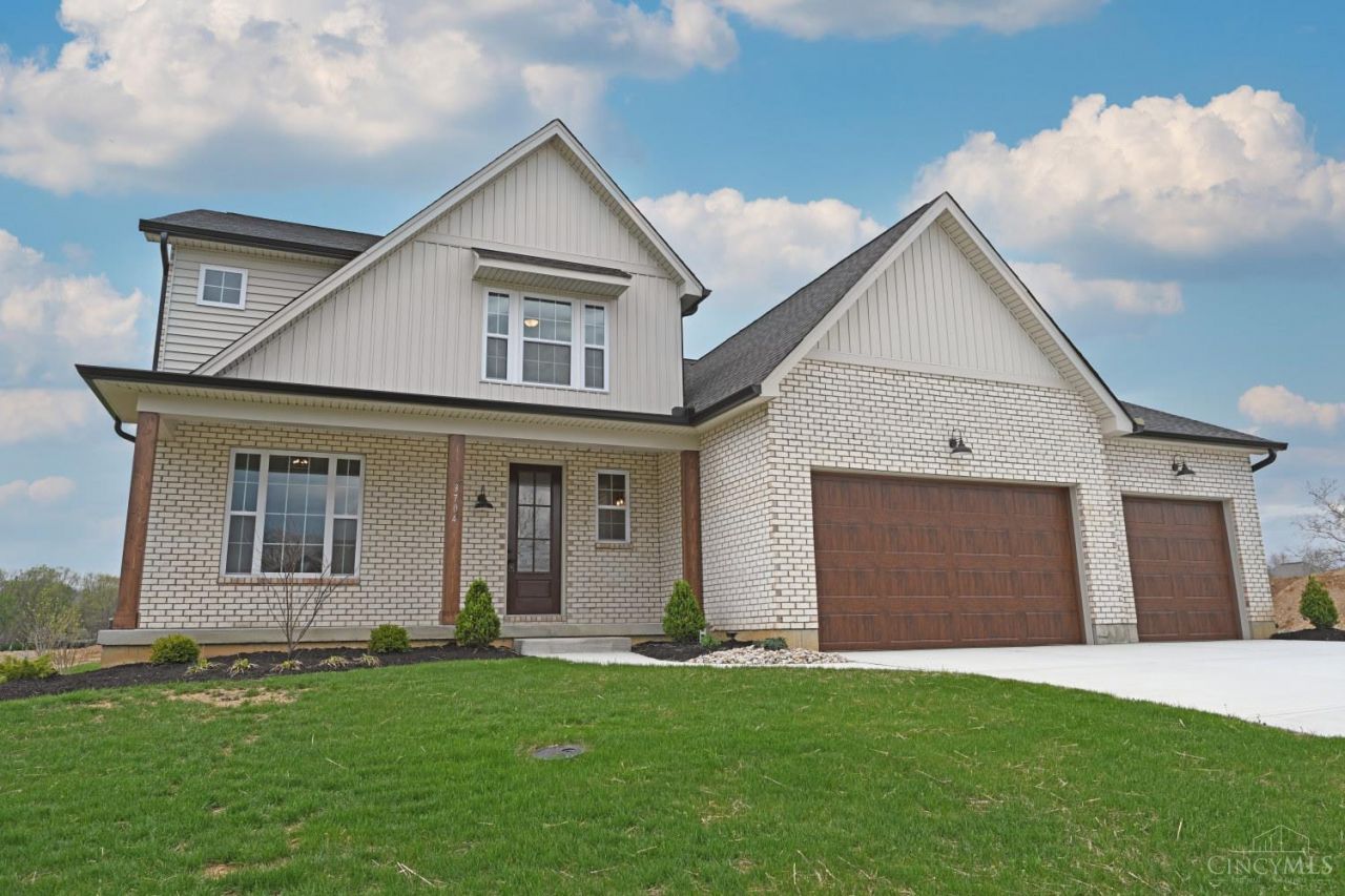 Enjoy sitting on your quiet front porch in this beautiful first floor primary home! Brick exterior, three car garage, and 9 ft ceilings on first floor. The large foyer leads to a grand two story great room featuring a custom wainscotting fireplace wall and linear electric fireplace. LVP throughout first floor. Large open kitchen, dining, and living area. the kitchen has quartz countertops, island, walk-in pantry, soft close cabinets, and tile backsplash. Primary bathroom has oversized tile shower with seat, double vanity with quartz tops and large walk-in closet. The three upstairs bedrooms have walk-in closets. First floor laundry has cabinets and counter with laundry tub arranged perfectly for a stacked washer/dryer. Mud room off garage with coat closet and custom bench. Agent has ownership and building company.