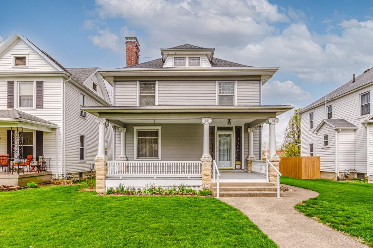 3 bed, 2 bath 1914 home in Miamisburg blending historic character w/modern updates. Grand entry w/ beveled glass door, stained glass windows & open staircase sets the tone. Natural woodwork, brass fixtures, chandeliers & refinished wood floors highlight craftsmanship, while abundant natural light fills spacious rooms. Large front porch w/ restored railings acts as extra living space overlooking charming neighborhood setting. FR w/ decorative FP, large DR w/ bay window, updated kitchen w/ great storage opens to spacious rec room addition. Upstairs has 3 beds & full bath w/ claw foot tub & marble floor, plus remodeled bath (2023). Back staircases add charm & function. Major updates: 2026 refinished wood floors, upgraded electric, interior paint, flooring in additions; 2025new roof, boiler, fridge; 2024 minisplit; 2022 exterior paint & porch updates; updated lighting & faucets. Tidy full bsmt, det 2.5 car gar,deck, above-ground pool & gardens. Near parks, bike path & downtown.