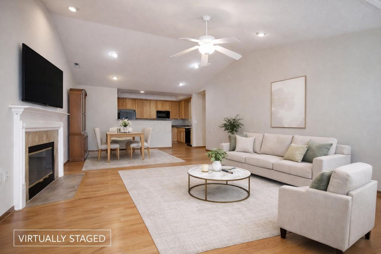 Beautifully maintained ranch style condo offering exceptional space and versatility. This thoughtfully designed home features a main level with an open concept layout with vaulted ceilings and a spacious great room anchored by a cozy gas log fireplace. The kitchen flows seamlessly into the living and dining areas, creating an ideal setup for everyday living and entertaining. Enjoy features like a breakfast bar, pantry, and included appliances, refrigerator, electric range, dishwasher, and microwave.The finished lower level is complete with a full bathroom, ideal for a guest suite, additional bedroom, or the perfect entertainment space. Two egress windows bring in natural light, making the lower level feel bright and inviting.Just off the entry, a charming three-season room with a wall of windows provides a peaceful spot to relax. The main floor includes three bedrooms with oversized doorways and two and a half baths, highlighted by a generous primary suite with a large walk in closet, double vanity, and walk in shower. A convenient first-floor laundry room includes a washer and dryer.Additional features include an attached two-car side load garage and pull down attic access for extra storage. The community offers fantastic amenities including a clubhouse with fitness equipment, party space, and a pool.Ideally located near shopping, dining, and medical centers, and within close proximity to Olentangy Liberty High School and Hyatts Middle School. This home combines low maintenance living with the space and comfort of a single family home.